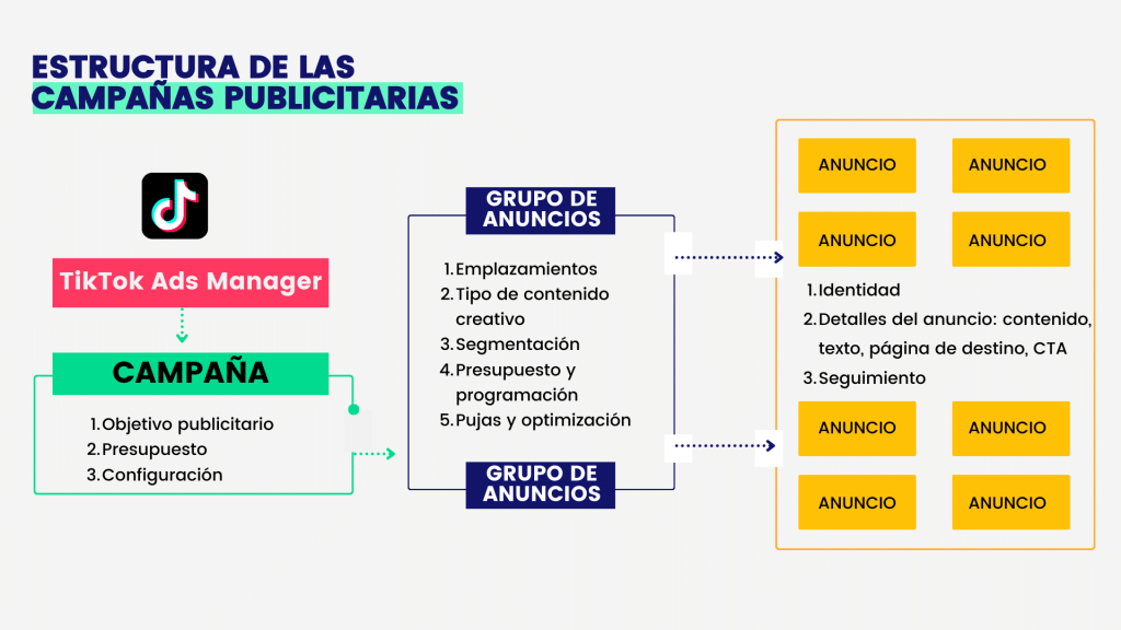 Una campaña en TikTok Ads es un conjunto de anuncios publicitarios gestionados desde la plataforma de TikTok Ads Manager. Su objetivo principal es promover productos, servicios o contenido de marca ante un público segmentado.